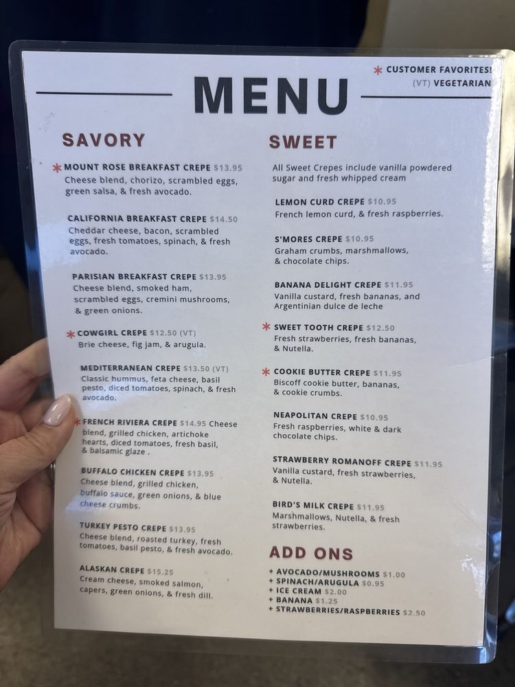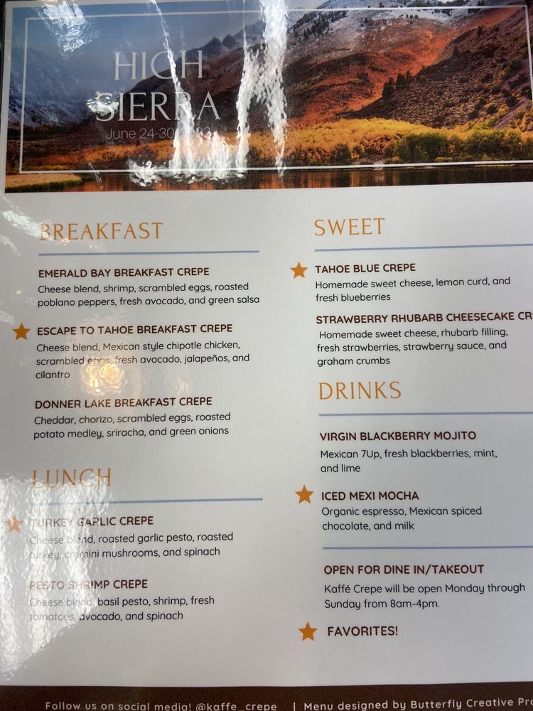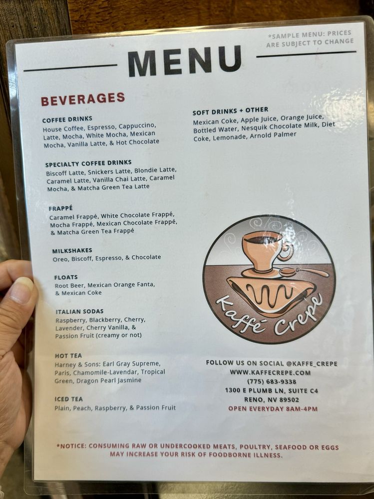 Ready to visit? Call them at (775) 683-9338 for reservations or check out their menu via QR codes when you arrive. Experience the magic of crepes at Kaffe Crepe!